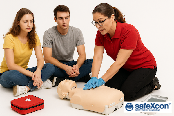 Die safeXcon GmbH unterstützt Sie dabei mit professionellen, praxisnahen und rechtssicheren Ersthelfer-Ausbildungen – direkt bei Ihnen vor Ort oder als zentral organisiertes Training.