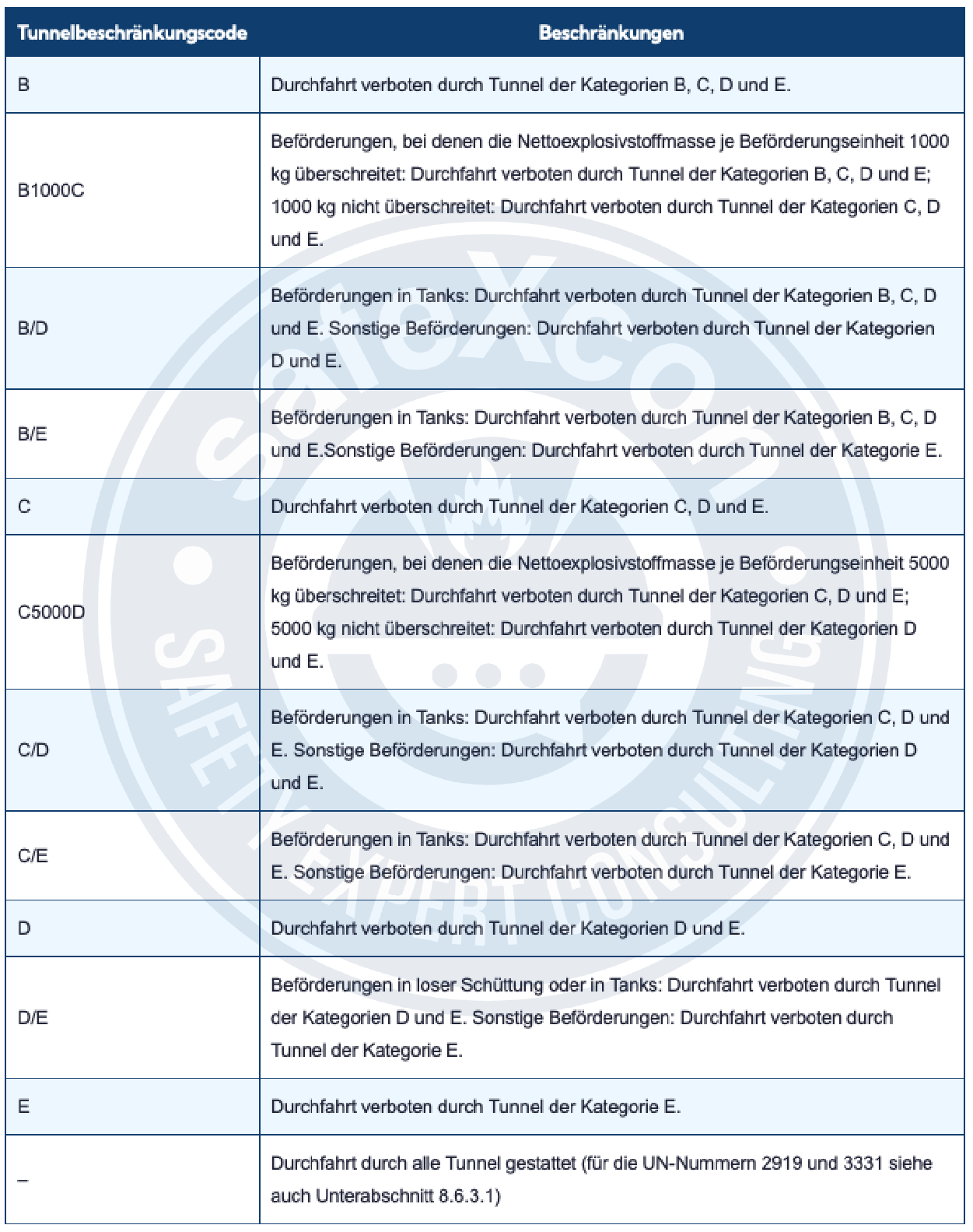 Die folgende Tabelle zeigt an, bei welchem Tunnelcode NICHT durch die entsprechende Tunnelkategorie gefahren werden darf.